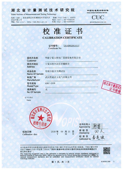 武漢凱迪正大KDKC2008有載分接開關(guān)測(cè)試儀校準(zhǔn)證書