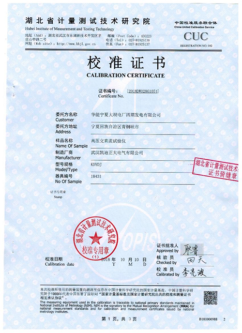 武漢凱迪正大KDYDJ高壓交直流試驗儀校準證書