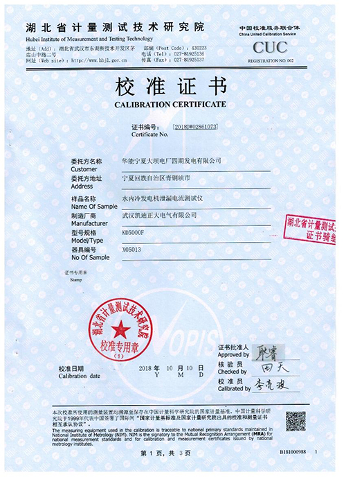 武漢凱迪正大KD5000F水內(nèi)冷發(fā)電機(jī)泄漏電流測試儀校準(zhǔn)證書