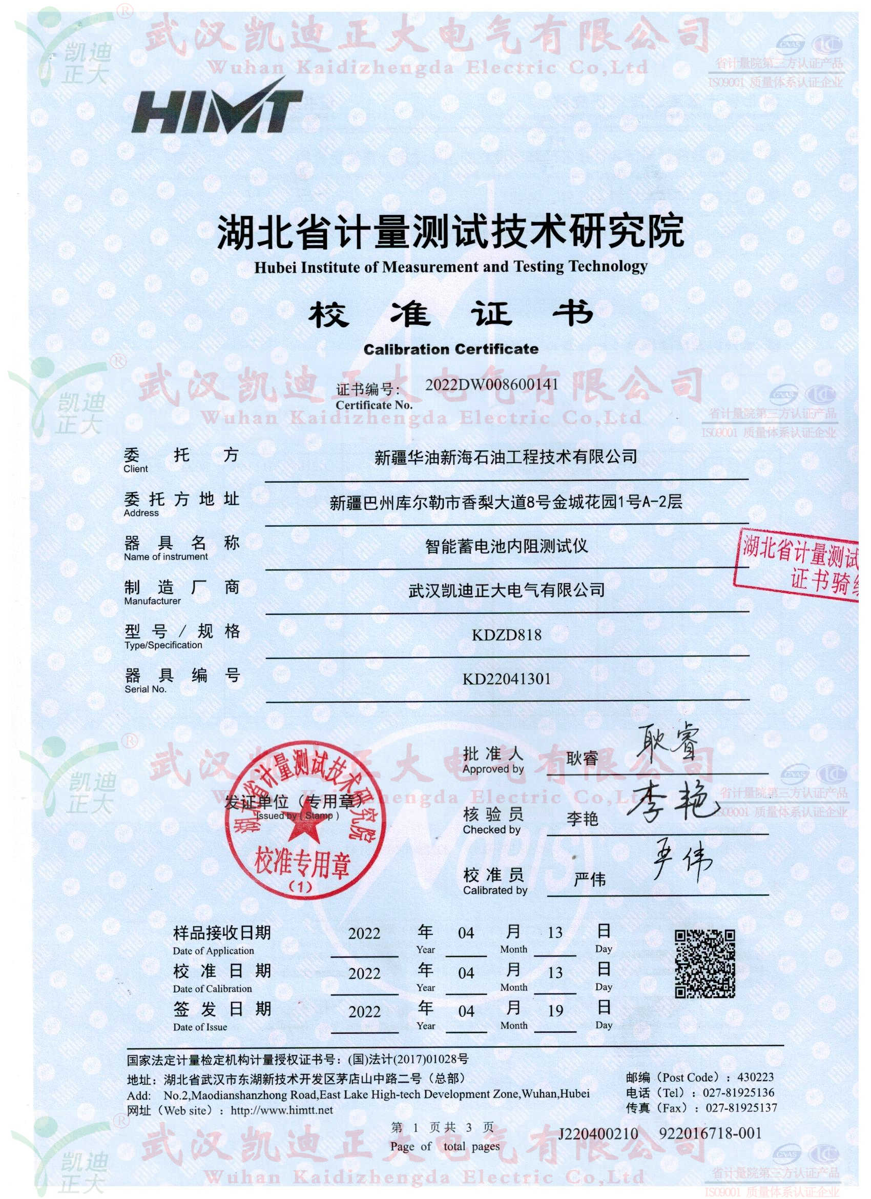 今年3月份,新疆華油工程部劉工致電我司。吐槽之前買的一批揚州某公司設備,使用不是很理想。這次選擇我們的KDZD818智能蓄電池內阻測試儀、KDZD882智能蓄電池放電監測儀等設備。話說“一朝被蛇咬十年怕井繩”,這次購買設備還是對比武漢幾家企業后綜合售后服務、品牌力、設備性能對比選擇我司,簽署技術協議并要求獲得湖北省計量測試技術研究院檢定報告,對于這些常規要求,我司幾乎有實力、有信心能夠獲得計量證書。