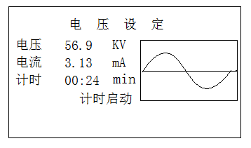 - 試驗電壓范圍為5KV至額定值。(請不要設小于5KV的試驗電壓),它規定了我們所要升至的試驗電壓。儀器升至接近這個設定電壓值時,就不再升壓,并保持在這個峰值下進行等幅的正弦波輸出。
