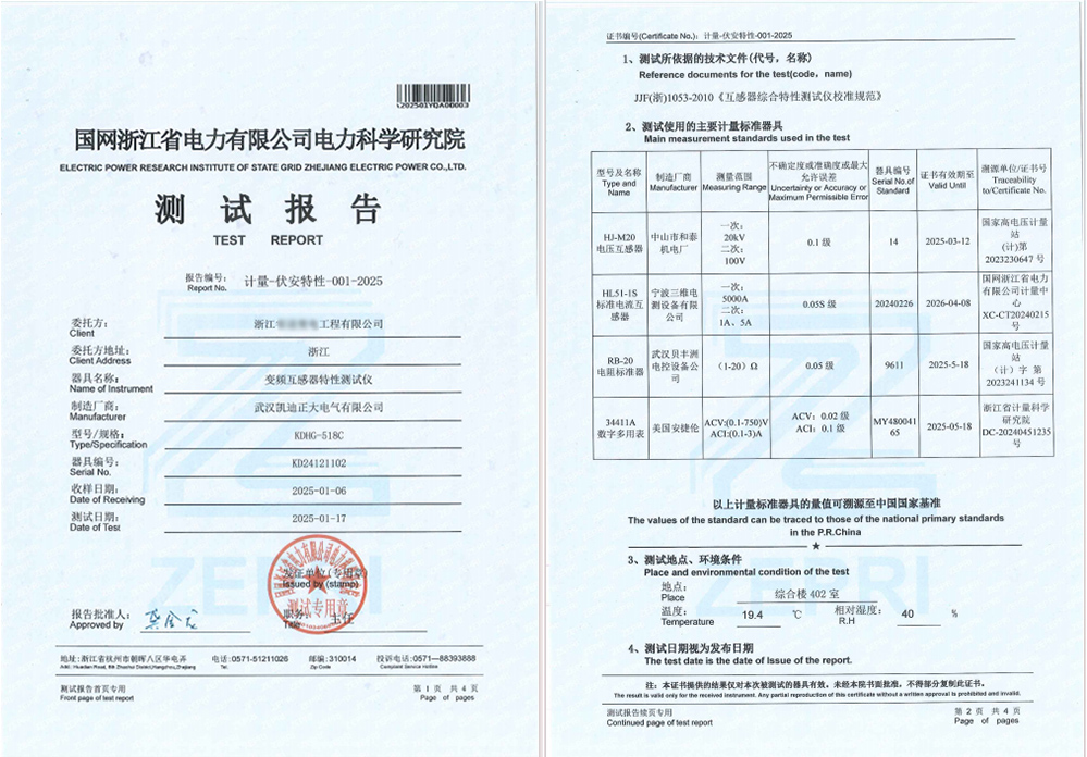 浙江某工程有限公司采購凱迪正大電氣生產(chǎn)的KDHG-518C變頻互感器特性測試儀,在國網(wǎng)浙江省電力有限公司電力科學研究院的嚴格校準測試中表現(xiàn)穩(wěn)定和可靠,順利通過各項性能指標的檢測,并成功獲得校準測試報告。彰顯了KDHG-518C變頻互感器特性測試儀的性能和質量,驗證了市場客戶在電力設備采購方面的專業(yè)眼光和嚴苛標準。