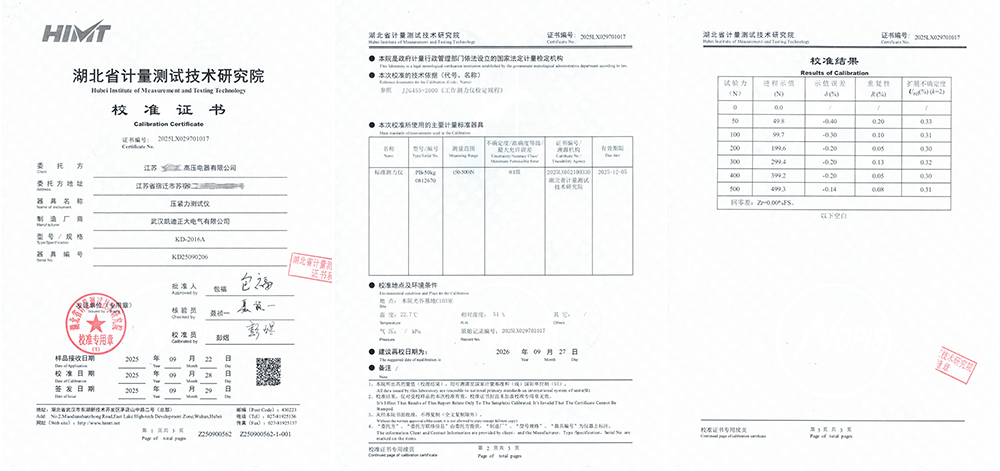 為確保測量數(shù)據(jù)的準確性和可靠性,客戶要求將采購的KD-2016A壓緊力測試儀送至湖北省計量測試技術(shù)研究院進行校準。校準證書編號為2025LX029701017,由該院權(quán)威出具,確保了設備的量值溯源至國家計量基準和國際單位制(SI)。