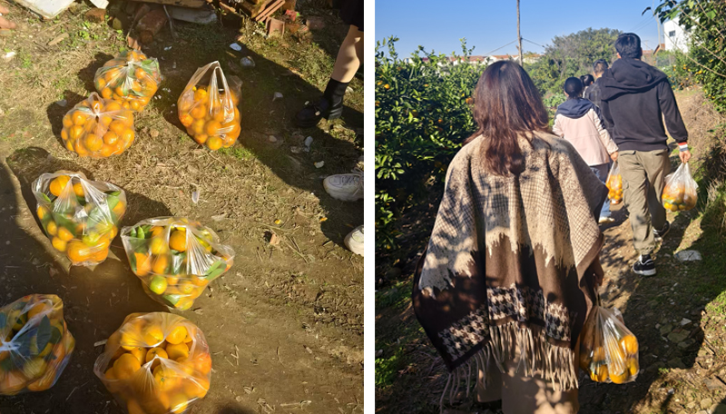 午餐的歡愉余韻未消,大家便迫不及待地提上果籃,奔向那片金色的海洋,真正的“探險(xiǎn)”就此開始!步入橘林,漫山遍野的橘樹碩果累累,金黃的果子掛滿枝頭,清新的果香沁人心脾。同事們瞬間化身“探險(xiǎn)家”,三五成群,穿梭于果樹之間。